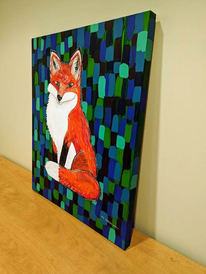 In this painting, a red fox with striking green eyes takes center stage, its intelligent yet cheeky expression capturing its unique personality. The fox's fur is meticulously detailed with expressive brushstrokes, each stroke adding depth and texture. Its vivid green eyes, the focal point of the piece draws you into the animal's world, inviting a moment of silent communion.